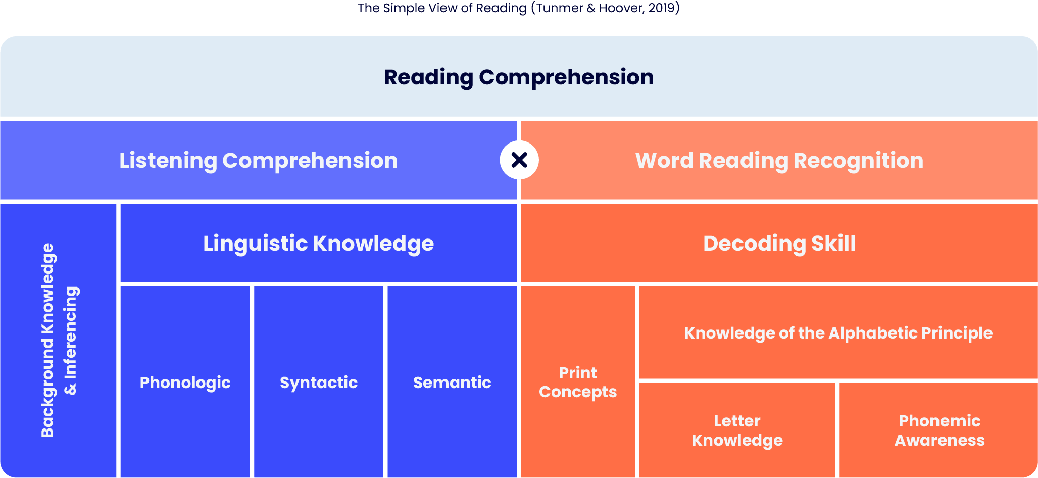 The Simple View of Reading helps us understand the impact of DLD and dyslexia on reading proficiency. Simple View explains that a student's reading comprehension is their listening comprehension multiplied by their ability to recognize written words.